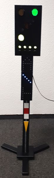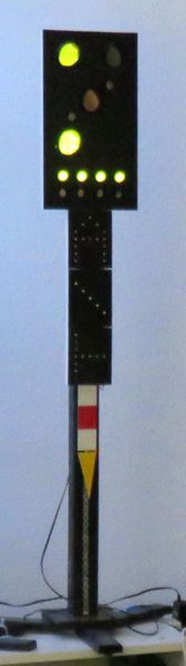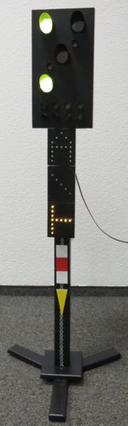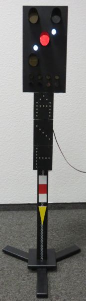 Bisher haben wir nur Hl-Signale mit Standardmaske (große und kleine Optiken sowie Lichtstreifen) gebaut, mit denen sowohl Vorsignale (mit magnetisch angebrachtem Signal Ne 2) als auch Hauptsignale mit und ohne Vorsignalfunktion (weiß-rot-weißes Mastschild, bei Vsig-Funktion mit Mastschild gelbes Dreieck) bzw. Blocksignale mit weiß-gelb-weiß-gelb-weißem Mastschild) dargestellt werden können. Das bietet Ihnen die Möglichkeit, ein ganz "normales" Hl-Signal durch veränderbare Mastschilder schnell zum umzurüsten.